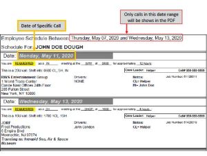 Below you will find a sample schedule PDF and a breakdown on how to read this document. Frost Productions works on military time. Please note, that to be confirmed for a Requested call you must respond to the email containing the PDF attachment AND receive a confirmation response from the Scheduling Department. <gallery>